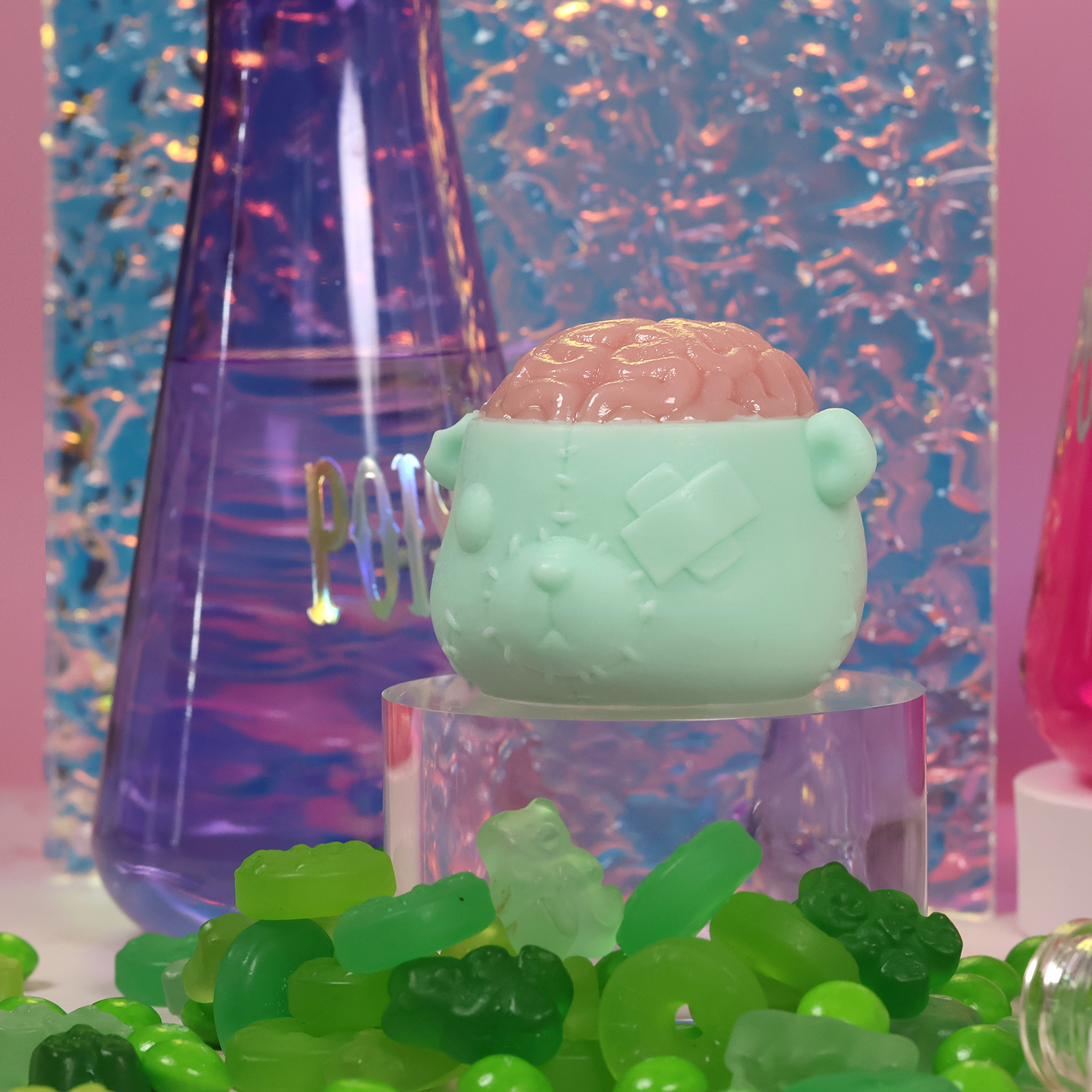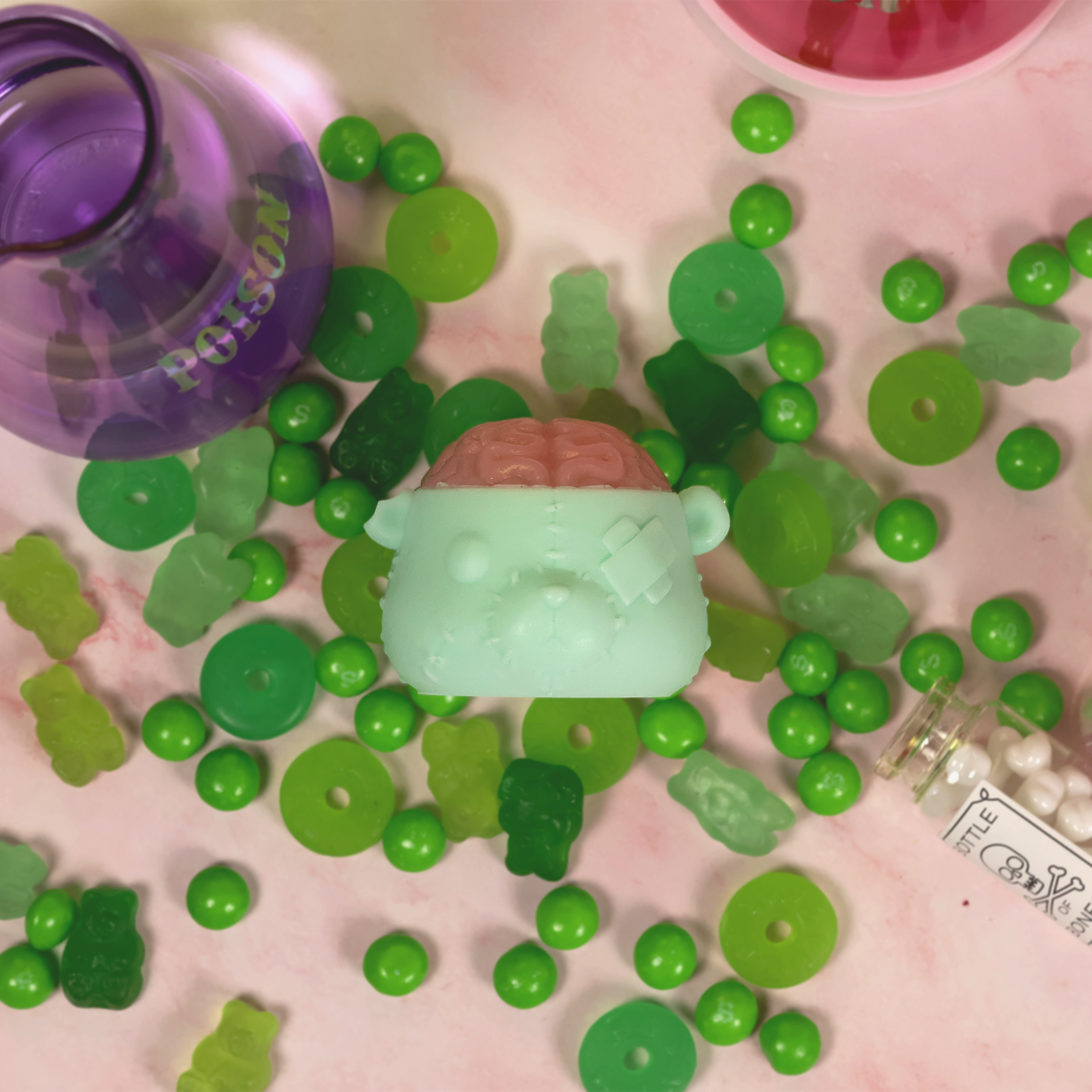 If you dare to find out, enjoy a thrilling "brainwash" with the jelly brain that will give you the creeps as if you are touching the real thing. But the horror is balanced out with the cuddly undead bear, who is gentle to your skin, vegan, and cruelty-free. He's not a bad zombie after all!