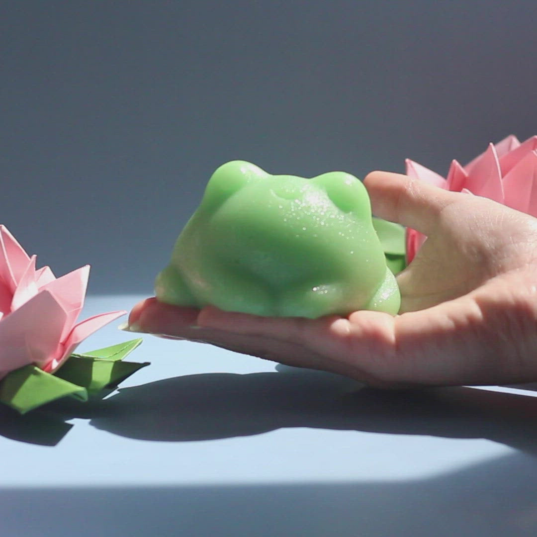 On a hot day, leave your jelly frog in the refrigerator for a few minutes before jumping in the shower for a cooling sensation. You can also hold him under running water to form a relaxing bubble bath.